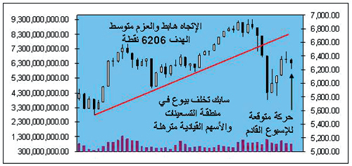 بداية من هذا الأسبوع يتوقع أن يشهد السوق حالة تذبذب واسعة النطاق ونشاطا قويا للمضاربين نظرا لاستمرارية تأثير عامل النفط على السوق وإعلانات الشركات حيث عادة ما يقوم المضاربون بالبيع قبل السماح للتنفيذيين بالتداول ولا يزال السوق اتجاهه العام هابطا والمخاطرة فيه عالية، أما سابك وفنيا يمكن أن تتمكن من زيارة مستوى 88 ريالا مجدداً، وبعد دمج حركة التداول لآخر 68 أسبوعا يرجح أن يغلق السوق عند 6290 نقطة بعد أن يزور مستوى 6206 نقاط.