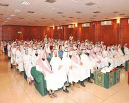 احتفلت كلية المعلمين بجامعة الملك سعود بالطلاب الخريجين والطلاب المتوقع تخرجهم والحاصلين على مراتب الشرف وذلك بحضور عميد الكلية الدكتور علي بن عبد الله العفنان ووكلاء الكلية ورؤساء الأقسام وعدد من أعضاء هيئة التدريس وأولياء الأمور. وافتتح اللقاء بآيات من الذكر الحكيم تلاها أحد الخريجين، ثم كان لعميد الكلية كلمة هنأ فيها الخريجين وأولياء أمورهم وأكد اهتمام الكلية بالتواصل مع الخريجين وأهمية تزويدها بالأفكار والمقترحات والخبرات، بما يسهم في تطوير البرامج المقدمة للطلاب. بعدها ألقى الدكتور إبراهيم الداود رئيس قسم التربية وعلم النفس كلمه فكلمة للدكتور محمد العريفي تضمن جملة من التوجيهات إلى أبنائه الطلاب في هذه المناسبة.