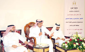 حيث بدئ اللقاء بالقرآن الكريم ثم ألقت عميدة كلية التربية لإعداد المعلمات بالدلم كلمة منسوبات كليات البنات شكرت الجميع على تنظيم هذا البرنامج الذي يخدم مصلحة العمل. بعد ذلك تحدث د. صالح القحطاني في كلمة له عن تطور الجودة وتطبيقها وموقع الجامعة ثم ألقى مدير الجامعة كلمته رحب من خلالها بالجميع على اهتمامهم والوقوف على جميع المشاكل لكي تتجاوز كثيرا من العقبات بجهود الجميع وما تقدمه الجامعة من خدمات لا بد أن ترضي الجميع ذاكراً بأنه سيتم قريبا وضع نظام اتصال لربط الكليات بالجامعة، وفي نهاية اللقاء أجاب د. العاصمي على استفسارات وتساؤلات الحضور.