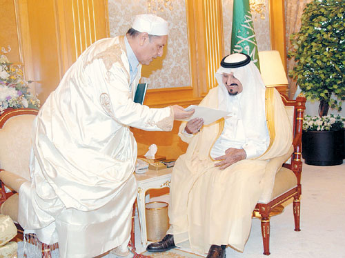 تسلم نائب خادم الحرمين الشريفين صاحب السمو الملكي الأمير سلطان بن عبدالعزيز رسالتين لخادم الحرمين الشريفين الملك عبدالله بن عبدالعزيز من فخامة الرئيس العقيد معمر القذافي رئيس الجماهيرية العربية الليبية الشعبية الاشتراكية العظمى تتضمن دعوة الملك المفدى لحضور القمة العربية الاستثنائية