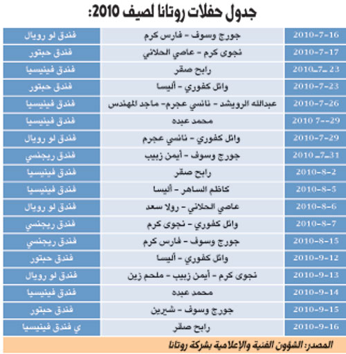 في صيف يقول الجميع إنه الأقصر خلال السنوات الحالية يستعد كثير من النجوم وخاصة فناني روتانا لإحياء مجموعة من الحفلات الغنائية حيث سبق وأن أعلنت الشركة في بيان مقتضب منتصف الأسبوع الحالي عن نيتها إقامة حفلات لعدد من الفنانين سمتهم دون الإشارة إلى تواريخ حفلاتهم، فيما تنشر (الجزيرة) اليوم الجدول النهائي المقرر لحفلات الصيف لهذا العام حيث شملت القائمة سعوديين اثنين فقط هما فنان العرب محمد عبده ورابح صقر والكويتي عبدالله الرويشد ونجوى كرم وجورج وسوف وأليسا وفارس كرم ووائل كفوري ونانسي عجرم وعاصي الحلاني وماجد المهندس وأيمن زبيب.