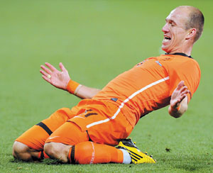 احتفل الهولندي أريين روبن بالهدف الذي سجّله أمس الأول الثلاثاء في المباراة التي فاز فيها منتخب بلاده على أوروجواي 3-2 في الدور قبل النهائي لمونديال 2010 المقام حالياً بجنوب إفريقيا.