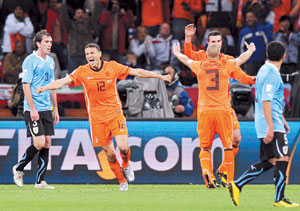 لم تظهر هولندا بتألقها المعتاد أمس الأول الثلاثاء لكن موجات الهجوم البرتقالية أثبتت تفوقها الشديد أمام أوروجواي قبل نهائي كأس العالم لكرة القدم المقامة حاليا في جنوب إفريقيا.
