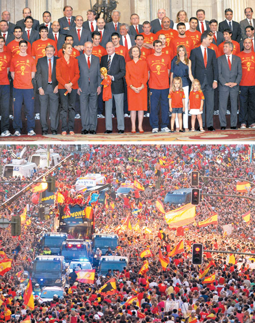 واعتبر الملك خوان كارلوس خلال استقبال الأبطال في القصر الملكي: (الانتصار مستحق من قبل منتخب استثنائي جعل قلوب جميع الإسبان تخفق)، مشيراً إلى (الفخر الكبير أن نرى إسبانيا بطلة للعالم. هذا النجاح يوحد الإسبان وينشر اسم إسبانيا في العالم أجمع).