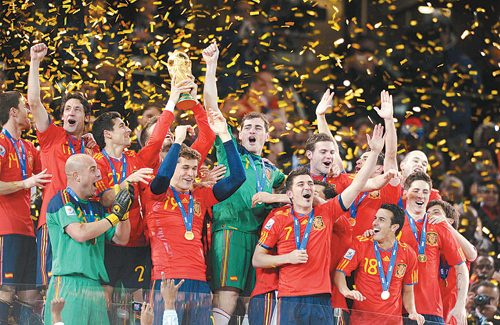 أما «ماركا» فكتبت: «انييستا حملنا إلى الجنة»، في إشارة منه إلى اندريس انييستا الذي سجل هدف المباراة الوحيد، مضيفة «لقد عانينا، لكن الأمر كان يستحق ذلك»، فيما كتبت «اس»: «إسبانيا استحقت فوزها ضد المنتخب الهولندي الذي لم يكف الضغط علينا طيلة المباراة». وصدرت الصحف الإسبانية أمس الاثنين حاملة جميعها من دون استثناء على صدر صفحاتها الأولى خبر «النصر التاريخي» بكأس العالم مع صور أبرزها لقائد المنتخب الحارس ايكار كاسياس حاملا الكأس. «ال بايس» عنونت «أبطال العالم»، مضيفة «إسبانيا بطلة العالم، الملحمة التي كانت تنقص الرياضة الإسبانية، أما صحيفة «أي بي سي» فعنونت «أبطال» مع صورة للمنتخب على الصفحة الأولى، معتبرة أن 11 يوليو 2010 بات جزءا من «تاريخ إسبانيا»، وأشارت إلى أن «هدف انييستا في الوقت الإضافي منح النصر لهذا الجيل المدهش».