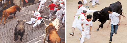 في إسبانيا تتدفق حشود على بامبلونا للاستمتاع بالسباق والمشاركة في مهرجان السباق مع الثيران، وفي كل صباح من أيام المهرجان السبعة يرتدي المشاركون ملابس بيضاء ويضعون حول رقابهم أوشحة حمراء ويركضون أمام قطيع من ستة ثيران في شوارع بامبلونا الضيقة وحتى ساحة مصارعة الثيران الرئيسية بالمدينة، ويسلك المشاركون نفس الطريق طوال أيام المهرجان السبعة. وهو تقليد قديم خلده الكاتب الشهير أرنست همنجواي في روايته (الشمس تشرق دائما).