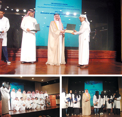 رعى صاحب السمو الأمير فهد بن مشاري بن فرحان آل سعود الحفل الختامي لبرنامج بن سينا لأبحاث العلوم الطبية في مستشفى التخصصي وذلك صباح اليوم الأربعاء في قاعة الأمير سلمان نيابة عن الدكتور سلطان السديري وهذا البرنامج إثرائي صيفي سنوي تقيمه موهبة لمدة شهر كامل في مركز الأبحاث بمستشفى الملك فيصل التخصصي بالرياض للطلاب الموهوبين من مختلف أرجاء المملكة حيث يقوم الطلاب ببرامج بحثية طبية، وقد حضر الحفل عدد كبير من المشاركين من الطلبة والطالبات والقائمين على البرنامج الذي بدئ بكلمة ترحيبية ألقاها الأستاذ محمد حسن واستهل بتلاوة عطرة من القرآن الكريم للطالب أحمد الجبر أعقبها كلمة المشرف على برنامج موهبة الأستاذ خالد الهديان والذي رحب في مستهلها بصاحب السمو الأمير فهد بن مشاري بن فرحان آل سعود وبالحضور. كما أشار في كلمته إلى ما قام به الطلاب في مجال العلوم البحثية الطبية، بعدها ألقى صاحب السمو الأمير فهد بن مشاري الفرحان آل سعود كلمة بهذه المناسب شكر فيها حكومة خادم الحرمين الشريفين على ما تبذله من جهود لرعاية الموهوبين كما شكر القائمين على البرنامج، ثم قدم الأستاذ سامي البدنة عرضاً مرئياً عن برنامج موهبة بعده ألقى الطالب محمد كدا كلمة الطلاب المشاركين في البرنامج بعدها كلمة أولياء الأمور ألقاها الأستاذ محمد باجنيد. وفي ختام الحفل كرم صاحب السمو الأمير فهد بن مشاري آل سعود الطلبة والطالبات المشاركين بشهادات التقدير كما كرم سموه البرامج المشاركة بدروع تذكارية.