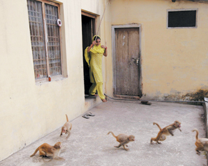 سيدة هندية تطرد مجموعة من القرود في إحدى القرى في الوقت الذي تستمر هذه القرود في دهم المنازل وسرقة المؤونة والإزعاج كل يوم |