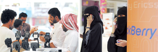 فتاتان تجريان اتصالات قرب لوحة تحمل شعار ال(بلاك بيري) . وفي الصورة الثانية سعوديون في أحد محلات بيع الجوالات يجسّون النبض حول الأسعار |