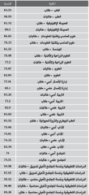 وأوضح أن النسب الموزونة التي تم قبولها في كليات الجامعة في دفعة يوم (السبت 26 - 8- 1431 هـ) هي على النحو الآتي: