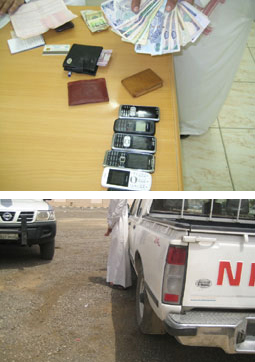 وعلى الفور تم توجيه الفرق القريبة من الموقع والبحث عن الجاني على ضوء أوصافه، ومسح الحي الذي وقع فيه الحادث والأحياء المجاورة، وقد أسفرت الجهود عن مشاهدة سيارة تنطبق عليها نفس الأوصاف الواردة في أقوال المبلغين، فتمت متابعتها وإيقافها بالقوة، فنزل الجاني هارباً جرياً على الأقدام فتمت ملاحقته والقبض عليه. التحقيق المبدئي معه قاد إلى إقراره بفعلته, وبتفتيش السيارة وجد بداخلها عدد (12) جهاز جوال من نوع نوكيا وبعد التأكد من اسم الشخص بجهاز مركز المعلومات الوطني اتضح بأنه مطلوب لأحد مراكز الشرطة، وقد استطاع المبلغون التعرف عليه، جرى تسليمه مع المضبوطات لمركز شرطة البطحاء.