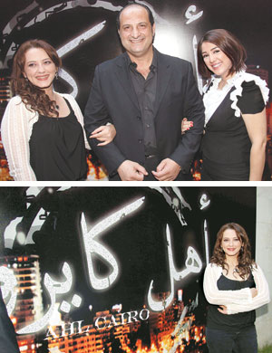الممثل خالد الصاوي يتوسط الممثلة المصرية كارولين خليل (يمين) والممثلةالسورية كندا علوش بعد مؤتمر صحفي ترويجي أقيم في العاصمة المصرية القاهرة لمسلسلهم الجديد ( أهل كايرو ). |
