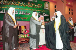 بعد ذلك سلم أمير المنطقة حفظة كتاب الله والداعمين شهادات التقدير، حيث أعلن عن تبرعات للوقف الخيري لجمعية تحفيظ القرآن الكريم تجاوزت مبلغ أربعمائة ألف ريال، منها (100) ألف ريال من الشيخ علي الجميعة، علي محمد الجميعة 100 ألف ريال وشركة فهد عبدالكريم المعجل عنهم أحمد المعجل 100 ألف ريال وشركة عبدالله عبدالعزيز التمامي وأولاده المحدودة 100 ألف ريال وخالد بن عبدالمحسن الباتع 50 ألف ريال وعليان راشد الحربي 50 ألف ريال وسلطان محمد المانع 1000 ريال وفاعل خير عن والدته 1000 ريال وعثمان سليمان السيف 1000 ريال وأحمد طلعت السيد 500 ريال.