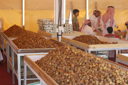يتميز مهرجان النخلة والتمور بمحافظة رياض الخبراء بعرض التمور على قوالب خشبية لسهولة المعاينة والتقليل من محاولة الغش في التعبئة الجاهزة.