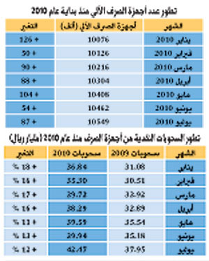 ونما عدد أجهزة الصرف الآلي في شهر يوليو 2010 إلى 10549 جهازاً، مقارنةً بـ 10462 جهازاً شهر يونيو الماضي، أي بزيادة 87 جهاز صرف.