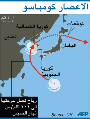 وبلغت سرعة الرياح التي حملها الإعصار كومباسو 139 كيلومتراً في الساعة لكن من المرجح أن يهدأ ليتحول الى عاصفة مدارية يوم الجمعة حسب ما ذكر موقع تروبيكال ستورم ريسك للتنبؤ بالطقس.. من جهة أخرى غادر كبير المبعوثين النوويين في كوريا الجنوبية أمس إلى الولايات المتحدة لبحث إمكانية إعادة إطلاق المحادثات حول البرامج النووية لكوريا الشمالية, حسبما ذكرت تقارير إخبارية. ويأتي هذا التحرك في أعقاب تصريحات للزعيم الكوري الشمالي كيم جونج إيل الأسبوع الماضي خلال زيارة للصين قال فيها إنه منفتح على «استئناف سريع» للمحادثات السداسية، التي تقاطعها بلاده منذ أبريل من العام الماضي بسبب العقوبات التي فرضتها عليها الأمم المتحدة.