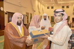 بعدها تفضل الشيخ المجلي بتكريم الداعمين وبتسليم الفائزين من حفظة كتاب الله الكريم ومن المبرزين في برامج المكتب جوائزهم. مما تجدر الإشارة إليه أن المكتب أقام خلال شهر رمضان الحالي عدد ( 65) محاضرة وكلمة ألقيت في عدد من المساجد ومشاريع تفطير الصائم بمرات كما نظم عدد من المسابقات الفردية والأسرية باللغة العربية وباللغات الحية الأخرى وقام بتوزيع ( 506) أشرطة دعوية و( 1450) مطوية إرشادية و( 1411) كتاباً و( 195) مصحفاً من إنتاج مجمع الملك فهد لطباعة المصحف الشريف و(85) مصحفاً مترجم المعاني بالإضافة إلى طباعته ( 8000) ألف نسخة من كتاب العشر الأخير باللغة الأوردية.