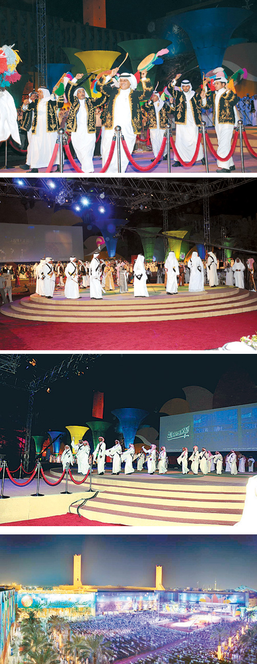 وستفتتح هذه الفعاليات بتقديم (5) فرق شعبية من مختلف مناطق المملكة عرضًا فلكلوريًا يستمر حتى الساعة الحادية عشرة ليلاً وذلك بمعدل ثلاثة عروض لكل فرقة، حيث ستبدأ هذه العروض فرقة الدرعية بتقديم العرضة السعودية ثم فرقة الدواسر التي تتولى تقديم العرضة السريعة، وفرقة الشرقية التي تعرض لوحة «الخماري»، وفرقة مكة المكرمة التي تتحف الجمهور ب»الخبيتي»، وفرقة عسير وعرضتها المميزة ب»القلطة».