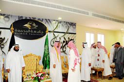 شرف مدير الجامعة الدكتور خالد المقرن حفل معايدة لمنسوبي جامعة المجمعة بمناسبة عيد الفطر المبارك، صباح السبت أول أيام الدوام الرسمي بعد عطلة العيد، وذلك بمجمع الكليات بالجامعة بحضور وكلاء الجامعة وعمداء الكليات والعمادات المساندة والمنسوبين من أعضاء هيئة التدريس والإداريين الذين قدموا التهاني لمعالي مدير الجامعة بهذه المناسبة، وسط أجواء أسرية رائعة تبادل فيها الجميع التهاني والأحاديث الأخوية.
