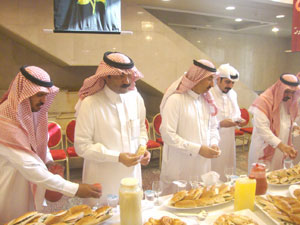 نظمت أمانة منطقة حائل حفل معايدة في بهو الأمانة الرئيسي بمقر أمانة المنطقة صباح أمس الأول حضره أمين منطقة حائل المهندس عبدالعزيز بن ابراهيم الطوب ومديرو الإدارات ورؤساء الأقسام والوحدات وموظفو الأمانة في جو سادته البهجة والألفة تبادلوا الجميع التهاني والتبريكات بمناسبة عيد الفطر المبارك واستئناف الدوام الرسمي بعد إجازة العيد السعيد، ثم تناول الجميع طعام الإفطار المعد بهذه المناسبة السعيدة.. أوضح ذلك مدير إدارة العلاقات العامة والإعلام بأمانة المنطقة بشير السميحان.