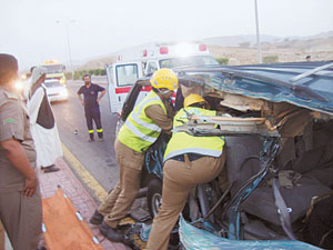 تبوك - عبدالرحمن العطوي مع بداية ثاني أيام العام الدراسي بدأ المسلسل المأساوي «نزفه» مجددًا بوفاة وإصابة خمس معلمات بعد خروجهن صباحًا أمس إلى مدارسهن بقرية «نابع داما»، التي تبعد 70 كم عن محافظة ضباء بتبوك؛ حيث توفيت معلمتان في الحال، فيما أُصيبت ثلاث أخريات بإصابات مختلفة. وقال الناطق