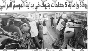 وقع حادث تصادم مروع في الساعات الأولى من صباح أمس الخميس على طريق تبوك-شرما بين سيارتين الأولى فورد تقل أسرة مكونة من الأب والأم وطفلين والأخرى مرسيدس تقل سبعة أشخاص وجميعهم شبان في مقتبل العمر، حيث كان التصادم وجها لوجه كما ذكره المقدم ممدوح بن سليمان العنزي الناطق الإعلامي للدفاع المدني بمنطقة تبوك وعلى بعد 20 كم عن شرما وقد نجم عن هذا الحادث المأساوي وفاة عشرة أشخاص هم الأب والأم وأحد طفليهما وإصابة الطفل الآخر وهو الناجي الوحيد من الحادث ووفاة السبعة أشخاص الآخرين في السيارة المرسيدس، مؤكدا أن الركاب كانوا محتجزين داخل السيارتين حيث تم بذل جهود كبيرة في فصل أجزاء السيارتين الملتحمتين واستخراج خمسة منهم، فيما قذف قوة الاصطدام شخصين خارج السيارة، وكانت ثلاثة فرق من الدفاع المدني من مركز البدع منها فرقتي إنقاذ وفرقة إطفاء قد باشرت الحادث، ويأتي هذا الحادث بعد أقل من ثلاثة أيام على حادث المعلمات الذي راح ضحيته معلمتين.