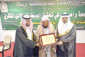 وبدأ الحفل بآيات من الذكر الحكيم، ثم ألقى ناصر الحسين كلمة الإدارة رحب فيها بالحضور مؤكدا على أن الله عز وجل وصف هذه الأمة بأنها أمة وسط مشيراً إلى أن العدل في الأحكام والتصرفات يوجب الوسطية والوسطية موافقة للعقل السليم..وأشاد بالدور البارز لأصحاب الفضيلة الخطباء في إصلاح الأمة وإنقاذها من التخبط في الظلام. بعد ذلك ألقى محافظ حريملاء كلمة رحب فيها بالدكتور يوسف السعيد معربا عن شكره لوزارة الشؤون الإسلامية على موافقتهم لإقامة هذه المحاضرة ومالها من أهمية في مجتمعنا.. وأضاف: أن الأمن الفكري تعود فائدته للمجتمع وأمنها واقتصادها. وأن المملكة مستهدفة من قبل الحاقدين والحاسدين.