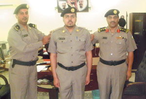 نيابة عن مدير إدارة دوريات الأمن بمنطقة تبوك العقيد سعود العلواني قلد نائب مدير إدارة دوريات الأمن بمنطقة تبوك العقيد فيصل ابن مسعد العنزي عددا من أفراد دوريات الأمن بتبوك رتبهم الجديدة والتي كانت من جندي الى رقيب أول بحضور الرائد مشعل العويضي والرائد خالد الشهري؛ حيث تم تهئنئتهم بالترقية، وحثهم العقيد العنزي لبذل المزيد من الجهد في سبيل خدمة وطنهم متمنيا لهم التوفيق كما أقيم في مقر إدارة دوريات الأمن بتبوك حفل معايدة لضباط وأفراد الإدارة؛ حيث أقيم حفل إفطار بهذه المناسبة صباح أمس السبت.
