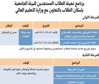 تبدأ فعاليات برنامج تهيئة الطلاب المستجدين للبيئة الجامعية الممول من وزارة التعليم العالي بإسكان الطلاب بجامعة الملك سعود يوم الاثنين القادم الموافق25-10-1432هـ باللقاء التعريفي بالخدمات المقدمة من الجامعة وعمادة شؤون الطلاب للطالب الجامعي بمسرح الإسكان بعد صلاة العشاء بحضور سعادة عميد شؤون الطلاب أ.د. فهد المسند ووكلاء العمادة، كما يشمل عدداً من البرامج والدورات المهمة التي تساعد الطالب على التعرف أكثر على إسكان الطلاب.