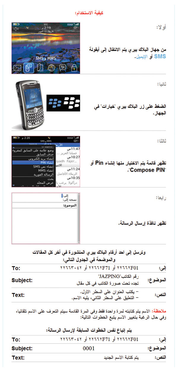 - ترسل إلى أحد أرقام البلاك بيري المنشور في آخر المقالات :