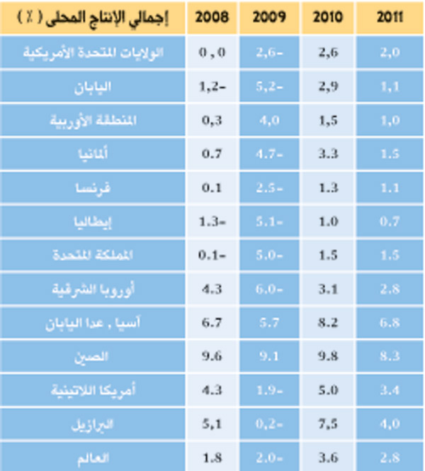 الاقتصاد العالمي سجل تعافياً واضحاً، فإجمالي الناتج المحلي العالمي زاد بمعدل 5.8% بين الربع الأول في 2009 والربع الثاني في 2010، مع تدفق قوي للإنتاج الصناعي العالمي بما يزيد عن 21% منذ الربع الأول 2009 وللتجارة العالمية بما يزيد عن 14% حيث إن هذه القفزة دعمت بواسطة عوامل دعم مؤقتة مثل (التوسع النقدي والانتعاش المالي الضخم خاصة في الولايات المتحدة والصين، مع استنفاذ تدريجي لفائض المخزون الكبير، غالباً في دول منظمة التعاون الاقتصادي والتنمية).