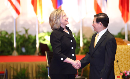 هانوي - (أ ف ب) خطفت وزيرة الخارجية الأمريكية هيلاري كلينتون الأضواء السبت خلال قمة دول شرق آسيا في هانوي؛ حيث أكدت مجدداً أن النزاعات المتعلقة بالجزر يجب أن تحل وفقاً للقانون الدولي، في موقف يثير استياء بكين، لكنه يبعث ارتياحاً لدى بقية دول القارة. ووزيرة الخارجية الأمريكية