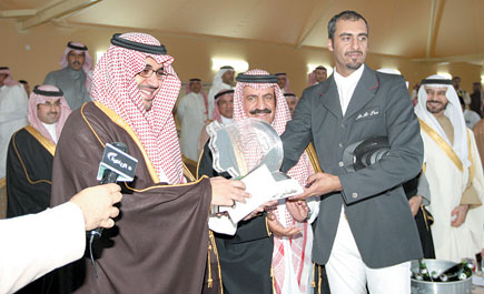 الجزيرة - الرياض: توج صاحب السمو الملكي الأمير نواف بن فيصل بن فهد بن عبدالعزيز نائب الرئيس العام لرعاية الشباب رئيس الاتحاد السعودي للفروسية امس أصحاب المراكز الثلاثة الأولى في شوط الجائزة الكبرى لبطولة المملكة الدولية السابعة لقفز الحواجز التي اختتمت امس وتأتي ضمن منافسات الدوري العربي