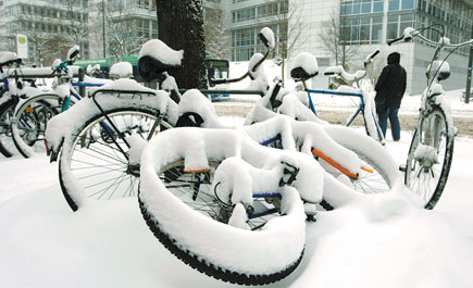 أجواء بالغة الصعوبة يشهدها الجزء الشمالي من الكرة الأرضية بتساقط كثيف للثلوج وانخفاض أشد لدرجات الحرارة، كما يبدو في إحدى ساحات محطة الأنفاق بميونيخ الألمانية حيث غطى الثلج دراجات هوائية ملقاة على الطريق.