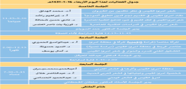 كما ألقى الشاعر صالح العوض عضو مجلس إدارة النادي قصيدة شعرية بعنوان (على خطى امرئ القيس) ثم قدم في الختام مقدم الحفل الأستاذ سالم العمري شكره وتقديره لسموه على هذه الرعاية الكريمة ولسمو نائبه ومعالي الوزير على حضورهم وتشريفهم لافتتاح الملتقى.