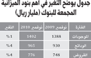 وعلى جانب الميزانية المجمعة للبنوك فقد سجلت موجودات البنوك العاملة في المملكة نموا بنسبة 1% بنهاية نوفمبر الماضي لتصل إلى 1402 مليار ريال، فيما ارتفعت الودائع إلى 965 مليار ريال بنسبة 4%، وقابل نمو الودائع نموا في محفظة القروض المجمعة للبنوك بنسبة 4% إلى 776 مليار ريال، كما يوضح الجدول أدناه: