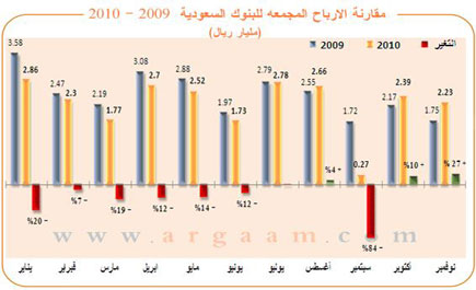 سجلت الأرباح المجمعة للبنوك العاملة بالمملكة نموا بنسبة 27% خلال شهر نوفمبر 2010 مقارنة بنفس الفترة من العام الماضي لتصل إلى 2.29 مليار ريال بحسب موقع أرقام.