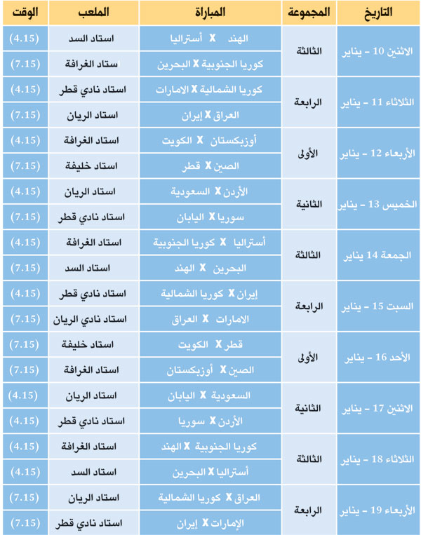جدول مباريات كأس آسيا لكرة القدم