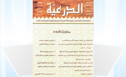مجلة (الدرعية) مجلة فصلية محكمة تعنى بتاريخ المملكة العربية السعودية والجزيرة العربية وتراث العرب وقد اشتمل العدد السادس والأربعون على عدد من الموضوعات منها: