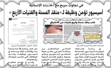 الجزيرة - الرياض رفض منقذ «المسنة والفتيات الأربع» الشاب فيصل الشمري عرض الوظيفة التي قُدم له من «أسيسيور للمحاماة» بحجة أن الراتب لا يناسبه، وبحسب خطاب الرئيس التنفيذي لـ»أسيسيور» المحامي عبدالحكيم بن عبدالله الخرجي الذي وجهه لرئيس التحرير أوضح من خلاله أنه تم عرض وظيفة براتب «4000» ريال...>>>...