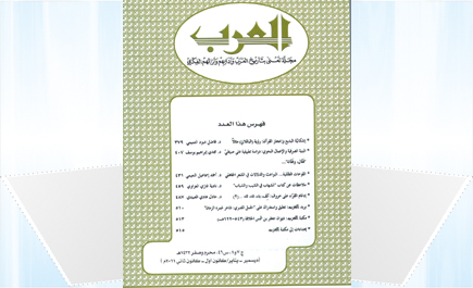 صدر عدد جديد من مجلة العرب المجلة التي تُعنى بتاريخ العرب وآدابهم وتراثهم الفكري.. وتضمن العدد بحثا بعنوان: (إشكالية البديع وإعجاز القرآن) للدكتور فاضل عبود التميمي.. ودراسة بعنوان: البنية الصرفية والأعمال النحوي وهي دراسة تطبيقية على صيغتي فعال وفعالة في ضوء الاستعمال والمادة اللغوية عند اللغويين العرب