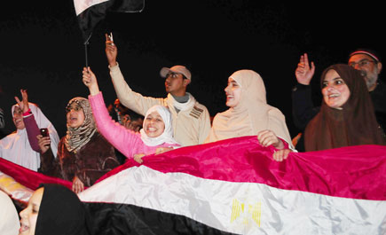 تدفق مئات الآلاف من المصريين من كافة الاطياف على ميدان التحريرالذي كان مركزا للاحتجاجات المطالبة بإسقاط النظام المصري، وعلى رأسه مبارك ورموز الحزب الوطني الحاكم على مدار 18 يوما، كان «ختامها مسك»، بحسب وصف احد المتظاهرين، حيث تنحى مبارك عن منصبه. انضمت الوفود المتدفقة إلى مئات الآلاف من المحتجين الذين شاركوا في المظاهرات منذ الصباح الباكر وعقب صلاة الجمعة في مشهد ضم كافة أطياف الشعب المصري وكافة الانتماءات السياسية والفئات العمرية مسلمين وأقباطا. واحتفلت جماهير الشعب التي امتلأت بها الشوارع والميادين في احتجاجات غير مسبوقة شهدها الشارع المصري على مدى الاسبوعين الاخيرين. عقب تخلي الرئيس حسني مبارك عن السلطة وردد مئات الآلاف ممن تجمعوا في ميدان التحرير بوسط القاهرة حيث بؤرة الاحتجاج الرئيسية «الشعب خلاص أسقط النظام .. الشعب خلاص أسقط النظام» في عرض لقوة الشعب لم يسبق له مثيل في تاريخ مصر الحديث. ولوح المحتجون بالأعلام وبكوا وابتهجوا وتعانقوا عندما اذيع النبأ عبر نظام الاذاعة الداخلية الذي أقامه المحتجون في التحرير. وتدفقت السيارات على شوارع القاهرة والاسكندرية ثاني اكبر المدن المصرية. وأطلق قائدو السيارات العنان لأبواق سياراتهم ولوحوا من نوافذها. وهلل المحتفلون في ميدان التحرير الذي تحول الى بحر من الأعلام المصرية وهتفوا قائلين «الله أكبر». وسلم مبارك السلطة للجيش منهيا ثلاثة عقود من رئاسة اكبر البلدان العربية سكانا. وصافح المحتجون الذين كانوا يتظاهرون أمام مبنى التلفزيون المصري مع الجنود الذي انتشروا هناك لحماية المبنى وقفز بعضهم فوق الدبابات.