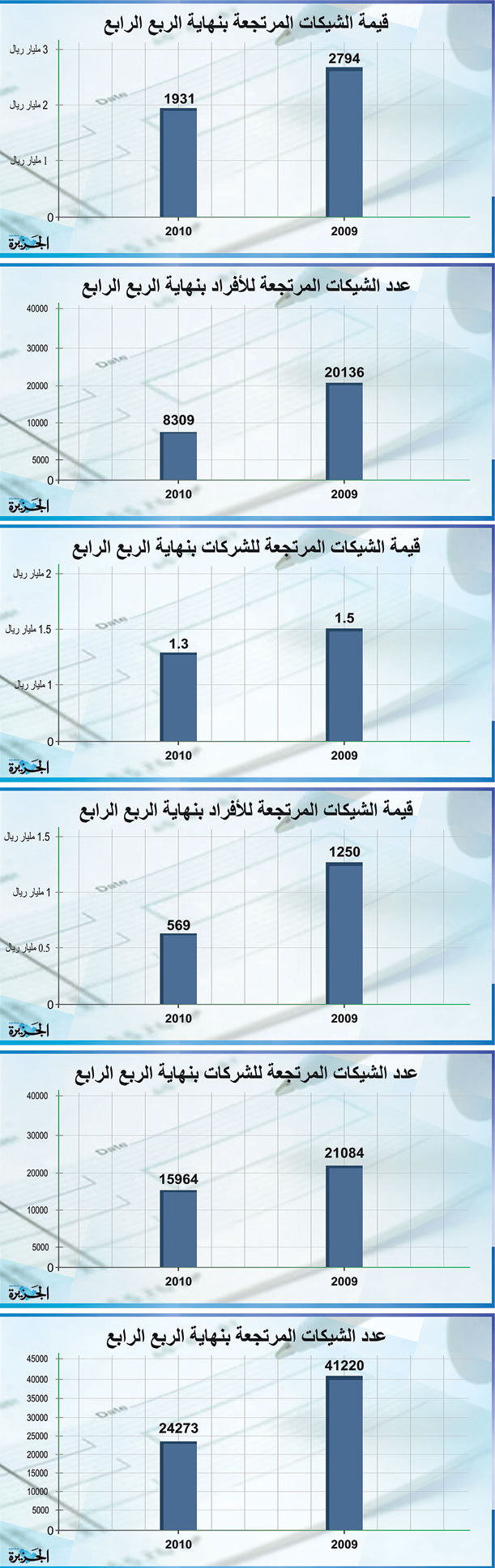 بعد انخفاض إجمالي قيمة الشيكات المرتجعة للشركات من حوالي 1.5 مليار ريال في نهاية الربع الرابع من 2009م إلى حوالي 1.3 مليار ريال في نهاية الربع الرابع من 2010م. فيما سجل إجمالي عدد الشيكات المرتجعة للشركات انخفاضًا ملموسًا في نهاية الربع الرابع من عام 2010م بنسبة 24 في المئة، حيث انخفض إجمالي عدد الشيكات المرتجعة للشركات من 21.084 ألف شيك في نهاية الربع الرابع من 2009م إلى 15.964 ألف شيك في نهاية الربع الرابع من 2010م.