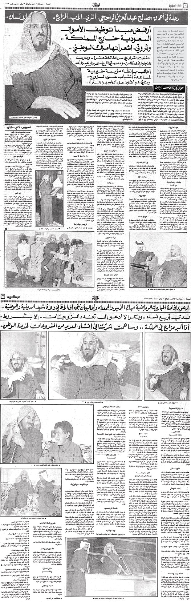 تعيد الجزيرة نشرحديث خاص لـ(الجزيرة) أجراه الزميل محمد الوعيل عام 1401ه، تناول فيه حياة الشيخ صالح بن عبدالعزيز الراجحي الذي انتقل إلى رحمة الله تعالى يوم أمس السبت 9 ربيع الأول 1432ه، حيث أسهم الشيخ صالح الراجحي -رحمه الله- أثناء مسيرته التجارية في خدمة بلاده وطنه من خلال خبرته في مجال الإدارة المصرفية والتجارة والأعمال، وقد ساهم في نمو اقتصادي واضح ومؤثر في السوق السعودي، من خلال 19 شركة ومؤسسة ساهم في تأسيسها ورئاسة وعضوية مجالس إداراتها.