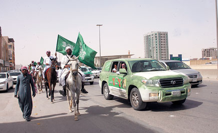 الجزيرة - ياسر الجلاجل / تصوير - فتحي كالي : 15 يوماً استغرقت رحلة أربعة شباب انطلقوا على ظهور الخيل من حائل إلى الرياض احتفاء بشفاء وعودة خادم الحرمين الشريفين، حاملين شعار «لا للفتنة.. لا للإرهاب». وقد وصلت القافلة التي أطلق عليها «رحلة فرسان الجبل» إلى الرياض يوم أمس،...>>>...