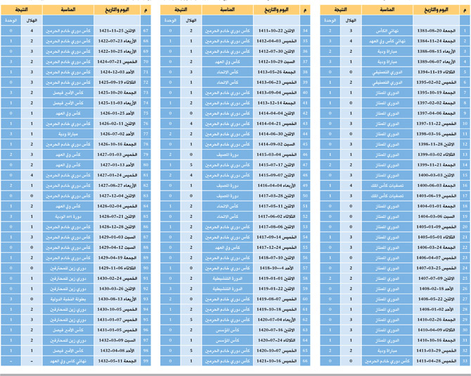 وجاءت مواجهة الفريقين في كأس خادم الحرمين الشريفين للأبطال مرتين وفي كأس المؤسس مرتين وفي كأس الملك 3 مرات وفي الدوري الممتاز 61 مرة وفي كأس ولي العهد 7 مرات وفي الدوري التصنيفي مرتين وفي كأس الأمير فيصل 10 مرات وفي الدورة التنشيطية مرتين وجرت بين الفريقين 5 مباريات ودية.