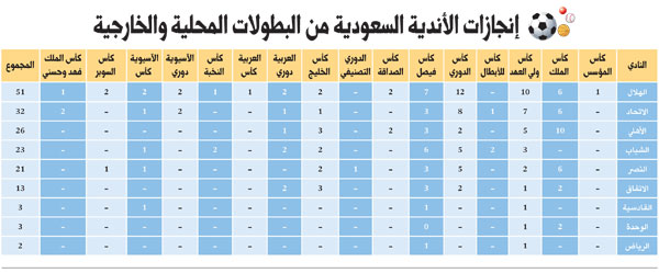 بعد أن أضاف الهلال كأس ولي العهد والشباب كأس فيصل بن فهد جدول إنجازات الأندية السعودية من البطولات محلياً وخارجياً لم يتغير