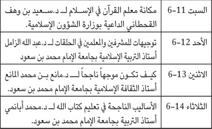 ينظم مركز الجمعية الخيرية لتحفيظ القرآن الكريم بالعزيزية بالتعاون مع مسجد الصحابة خلال الأسبوع القادم 11-14-6 ملتقى المعلمين والمشرفين في حلقات تحفيظ القرآن الكريم وذلك من خلال عقد محاضرات ودورات تربوية تهدف إلى رفع المستوى التربوي لدى القائمين على حلقات التحفيظ وهي على النحو التالي: