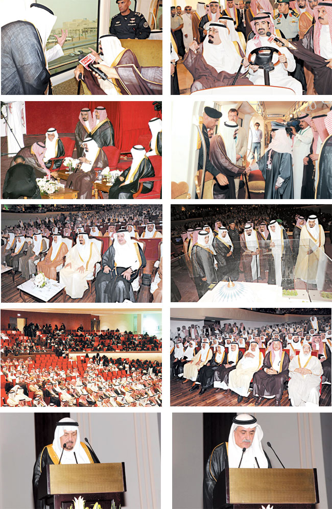 رعى خادم الحرمين الشريفين الملك عبدالله بن عبدالعزيز آل سعود -حفظه الله- بعد عصر أمس حفل افتتاح المدينة الجامعية لجامعة الأميرة نورة بنت عبدالرحمن التي تم إنشاؤها على أرض تبلغ مساحتها ثمانية ملايين متر مربع وبتكلفة إجمالية تزيد عن عشرين مليار ريال. وكان في استقباله - أيده الله - لدى وصوله مقر الجامعة الجديد على طريق المطار صاحب السمو الملكي الأمير سلمان بن عبدالعزيز أمير منطقة الرياض ومعالي وزير المالية الدكتور إبراهيم بن عبدالعزيز العساف ومعالي وزير التعليم العالي الدكتور خالد بن محمد العنقري ومعالي مساعد وزير المالية المشرف على مشروع الجامعة الدكتور محمد المزيد. وفور وصول الملك المفدى استقل قطار النقل الآلي حيث قام -أيده الله- بجولة على أرجاء الجامعة اطلع خلالها على منشآتها واستمع إلى شرح مفصل من معالي وزير المالية ومن معالي مساعد وزير المالية المشرف على المشروع عن المشروع ومراحله وما اشتمل عليه من منشآت إدارية وتعليمية وسكنية وخدمية. بعد ذلك توجه خادم الحرمين الشريفين الملك عبدالله بن عبدالعزيز آل سعود إلى مبنى الإدارة الرئيسة حيث تجول -حفظه الله- بالعربة الكهربائية في أرجاء المبنى وكذلك مبنى المكتبة المركزية حيث استمع -رعاه الله- إلى شرح واف عن المبنى. ثم توجه الملك المفدى إلى مقر حفل الافتتاح حيث عزف السلام الملكي فور وصوله -أيده الله-.