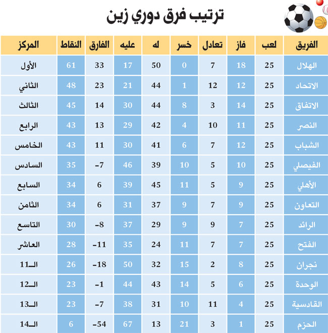 أكد مدير عام المكتب الرئيس لرعاية الشباب بمنطقة الرياض عبدالرحمن المسعد ان ختام مباريات الموسم بين فريقي الهلال ونجران ستقام في ستاد الأمير فيصل بن فهد بالرياض حسب الترتيبات المسبقة لهذه المباراة التي ستشهد تتويج الهلال بطلا لدوري زين للمحترفين وتتويج صاحبي المركزين الثالث والرابع وأصحاب المراكز الثلاثة في اللعب النظيف.